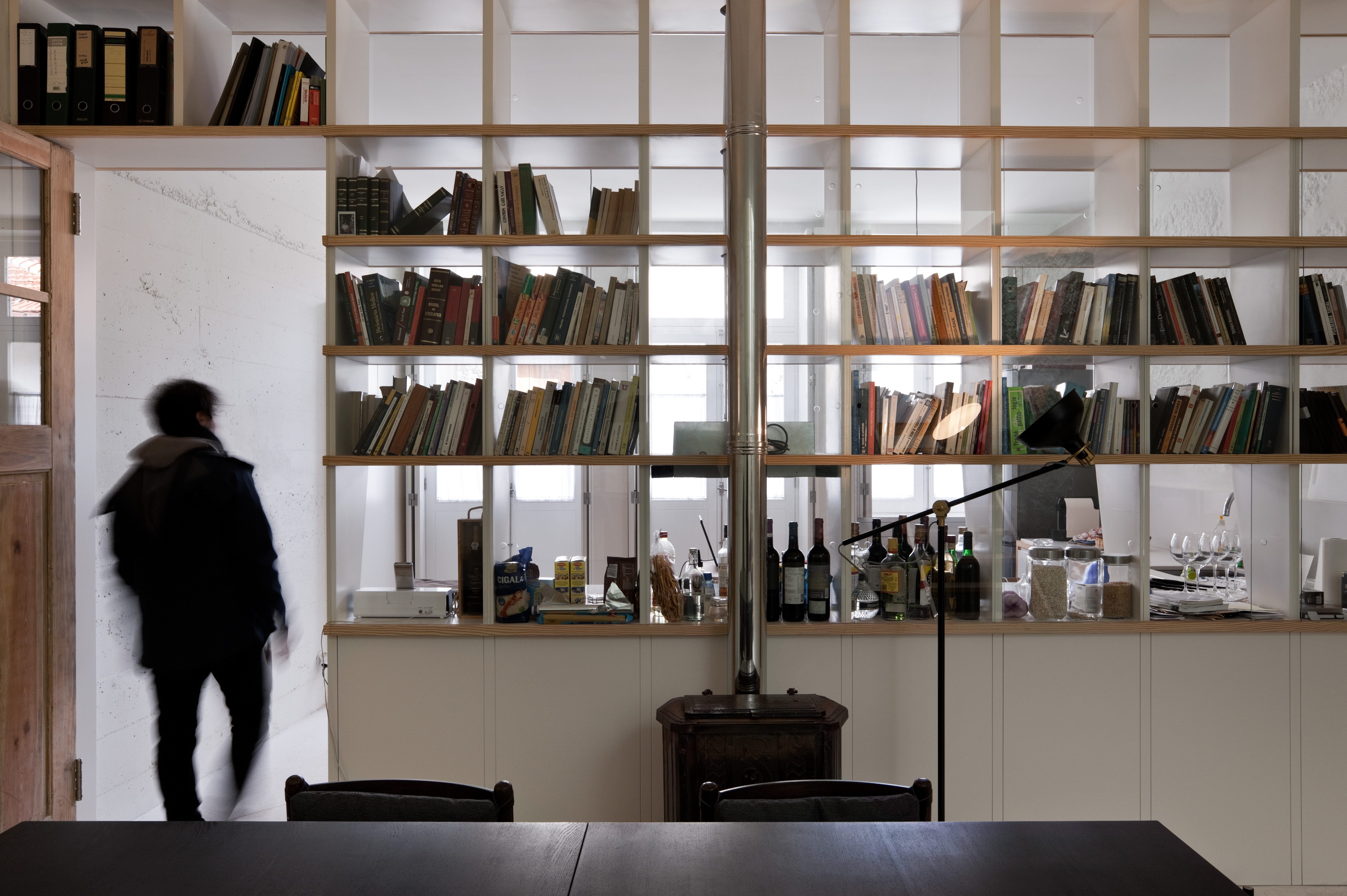The social space on the ground floor – living room and kitchen – is fisically divided, and visually united, by a piece of furniture that works simultaneously as a bookshelf and a cupboard, as it can be accessed through it’s glass sliding frames from both sides. So you can have books in one shelf and ktichen stuff in another. It also filters light in a very subtle way.